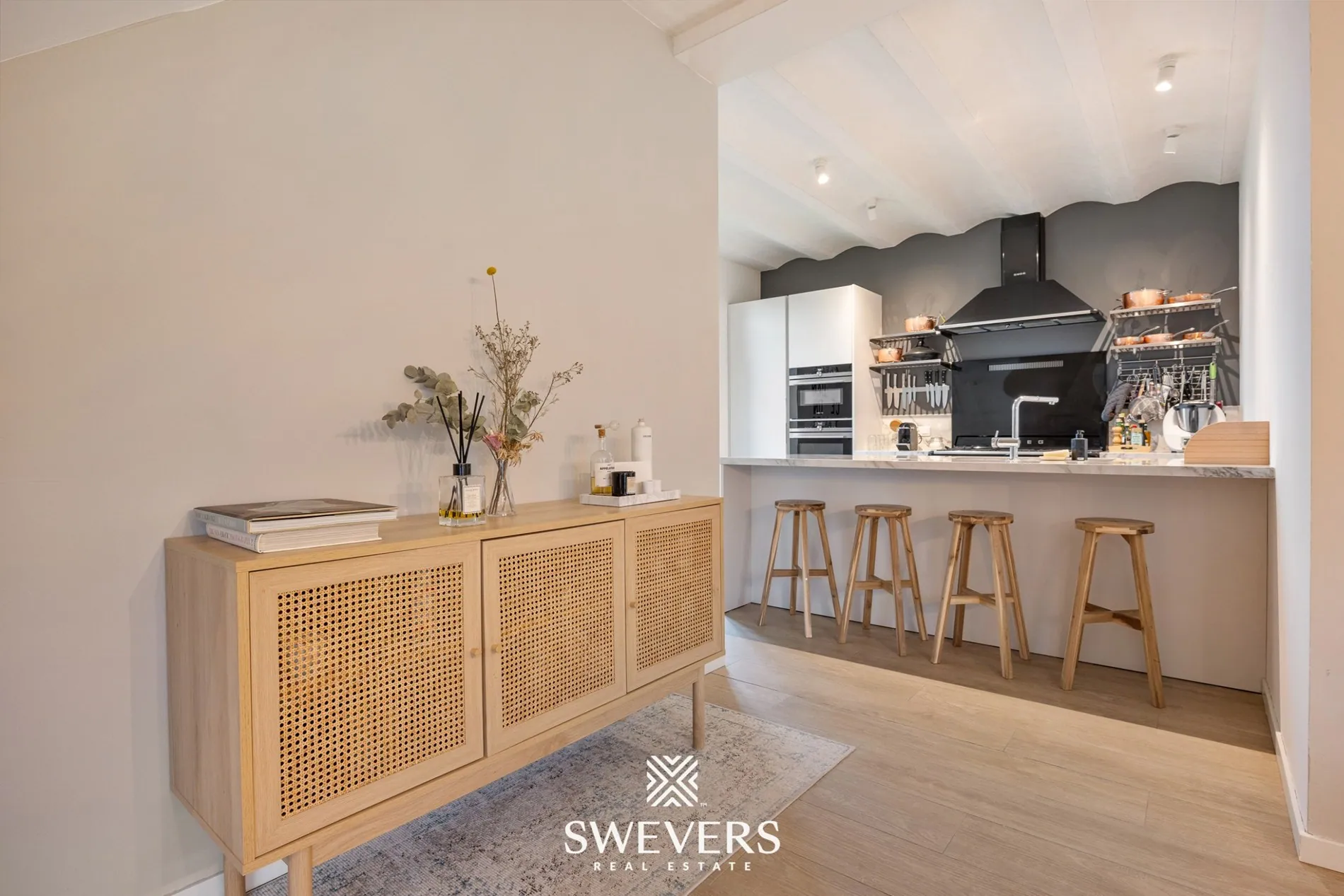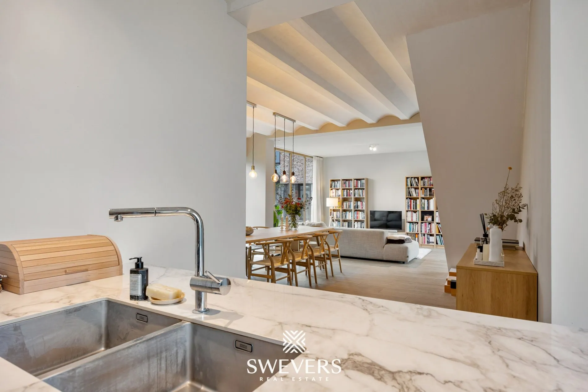 De leefruimte op de begane grond is één open geheel met duidelijke zones voor wonen, eten en koken. De lichtrijke woonkamer van 27,64 m² bevindt zich aan de tuinzijde en sluit naadloos aan op de eetruimte, waardoor je geniet van een uitnodigende leefzone. Grote ramen zorgen voor een directe connectie met de buitenruimte. De keuken van 12,78 m² is doordacht ingericht, met een centraal eiland , én is uitgerust met toestellen. Aansluitend vind je een aparte berging, ideaal voor voorraad of huishoudtoestellen. De hal biedt toegang tot een apart gastentoilet en vormt een mooie inkompartij.