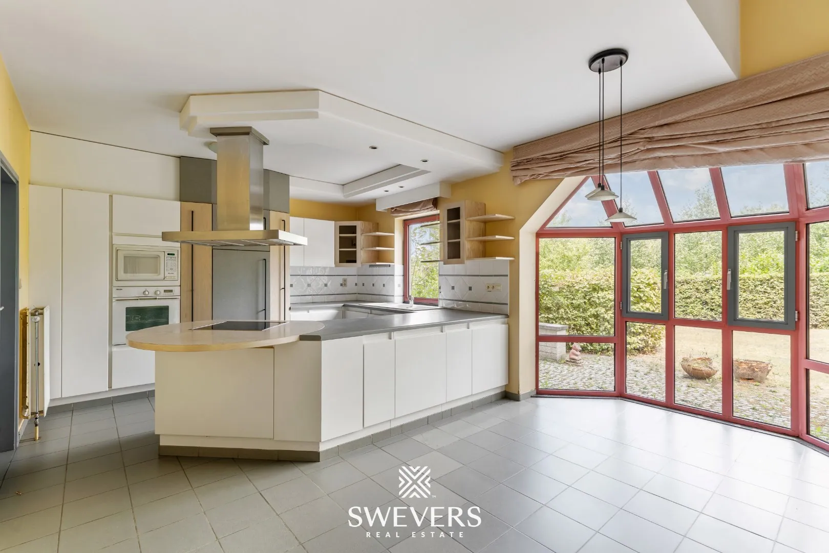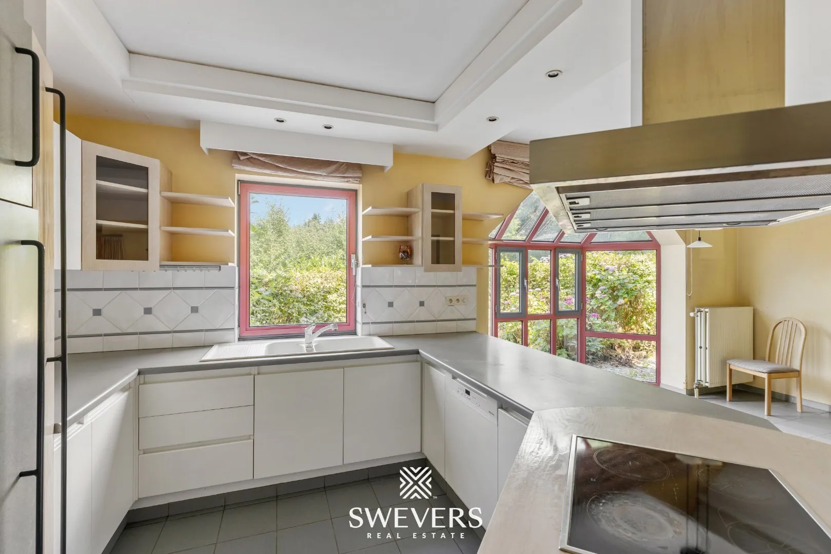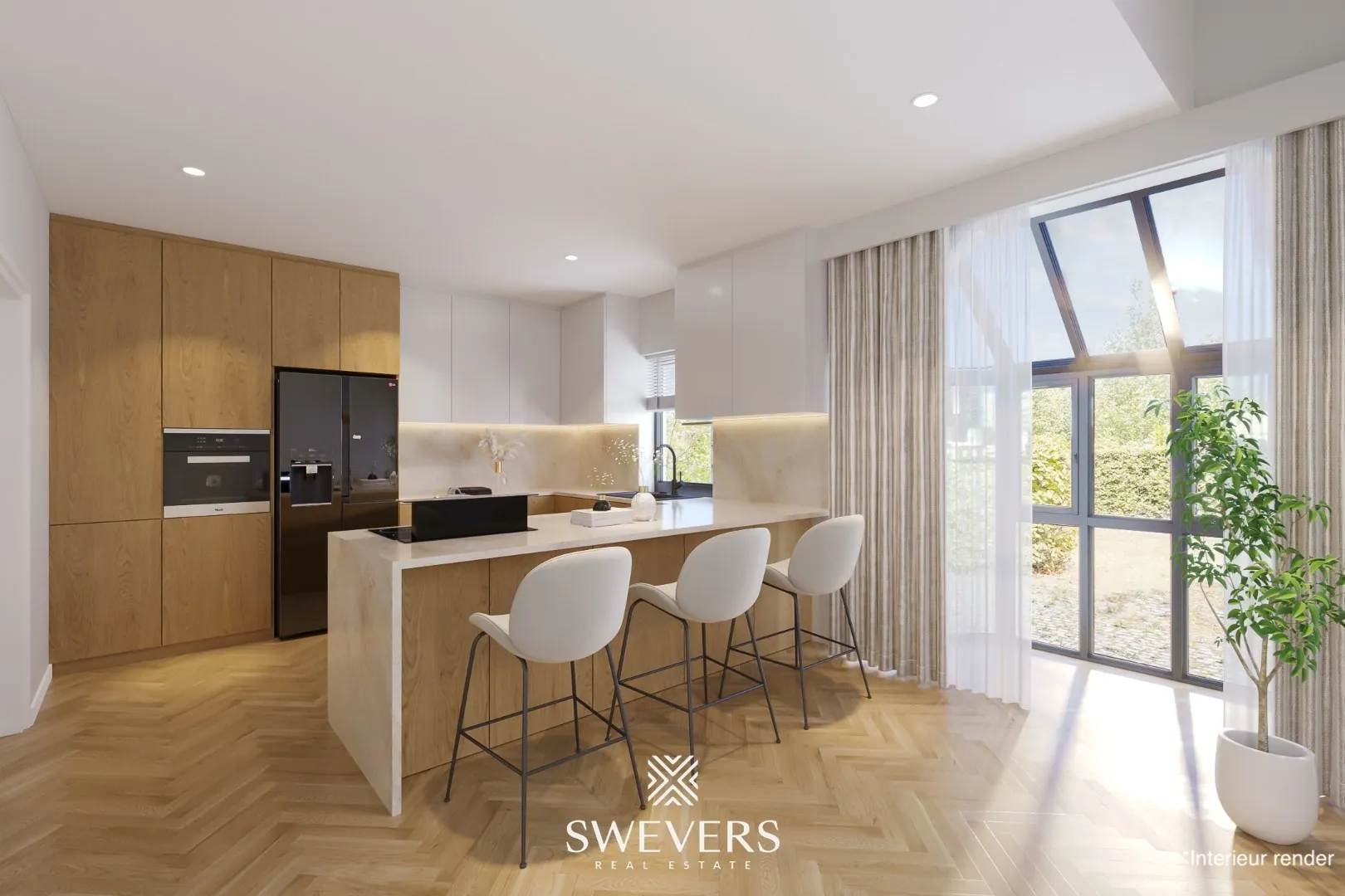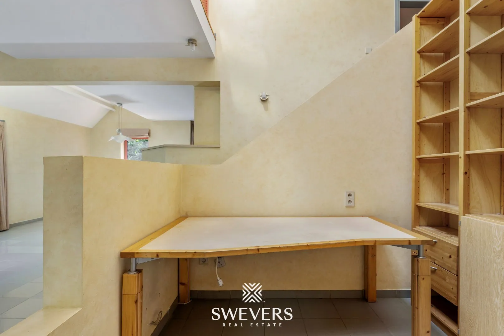 Op de begane grond bevindt zich een ruime inkomhal die onmiddellijk toegang geeft tot een apart gastentoilet. Rechts bevindt zich de royale woonkamer van 32,80 m². Deze ruimte geniet dankzij de erker van bijzonder veel natuurlijke lichtinval en biedt vlotte connectie met de aangrenzende keuken. Vanuit de woonkamer leidt de centrale traphal naar de bovengelegen verdiepingen. Achteraan de woning bevindt zich de keuken van 10,02 m², die dankzij de rechtstreekse toegang tot de tuin perfect kan omgevormd worden tot een open leefkeuken met zicht op het groen. Aansluitend is er een functionele bijkeuken en een aparte wasplaats/berging, wat zorgt voor extra opbergmogelijkheden en praktische indeling. Verder is er nog een afzonderlijk bureau, ideaal voor thuiswerk of als stille hobbyruimte. Tot slot is de garage van 20,90 m² inpandig bereikbaar, wat het comfort verhoogt.