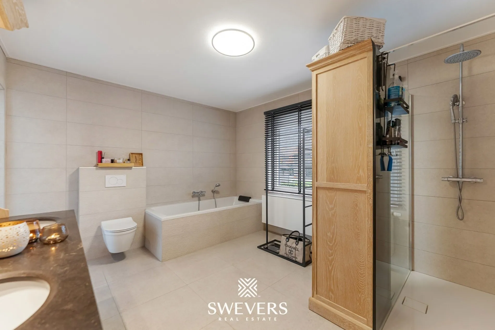 De vernieuwde badkamer straalt luxe en rust uit. Een ruime inloopdouche, een modern ligbad, dubbele wastafel en toilet zorgen voor een gevoel van pure wellness in eigen huis. Alles werd tot in de puntjes afgewerkt, met tijdloze materialen en oog voor stijl en duurzaamheid.