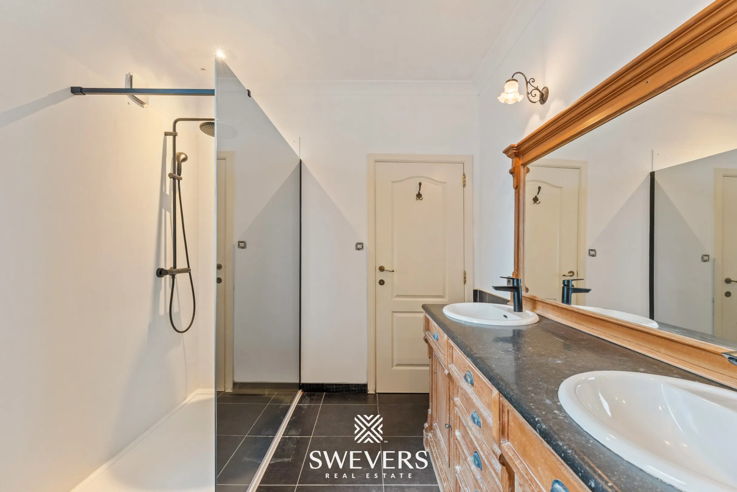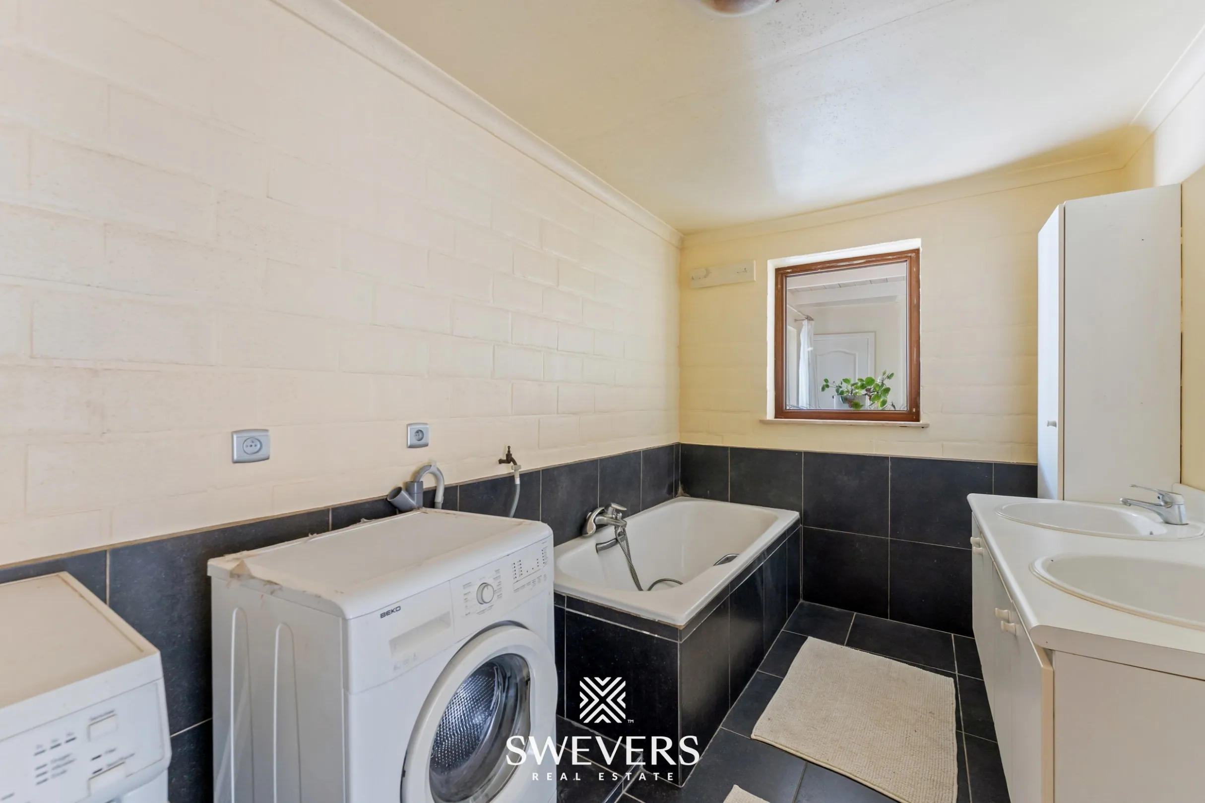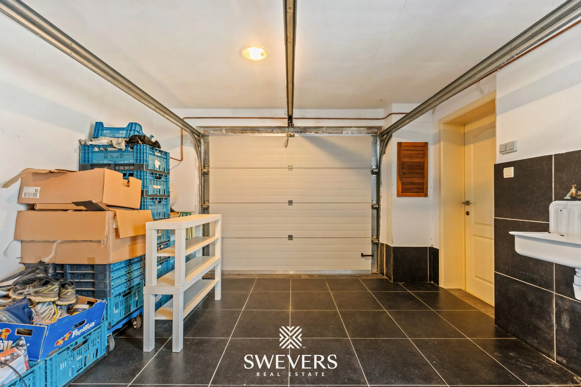 Op het gelijkvloers wordt de inkomhal centraal geplaatst, wat zorgt voor een efficiënte verbinding tussen de verschillende ruimtes. Aan de voorzijde bevindt zich een bureauruimte, ideaal als thuiskantoor of hobbykamer. De lichtrijke woonkamer en eetkamer vormen samen met de ruime keuken van 24 m² het hart van de woning. Vanuit de keuken is er toegang tot een tweede hal met aansluitend een praktische berging en de veranda. Verder zijn er twee aparte bergruimtes en een gastentoilet aanwezig. De inpandige garage van 17 m² is rechtstreeks toegankelijk vanuit de hal. Op het gelijkvloers zijn er ook maar liefst 2 badkamers aanwezig met ligbad, douche en dubbele lavabo.