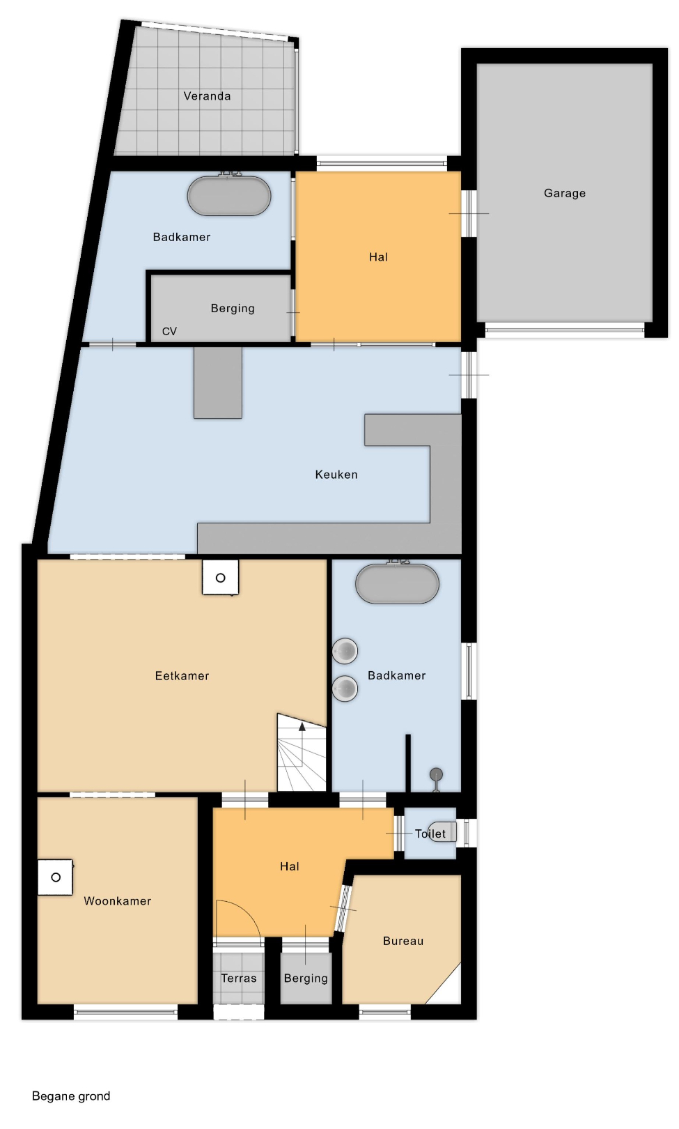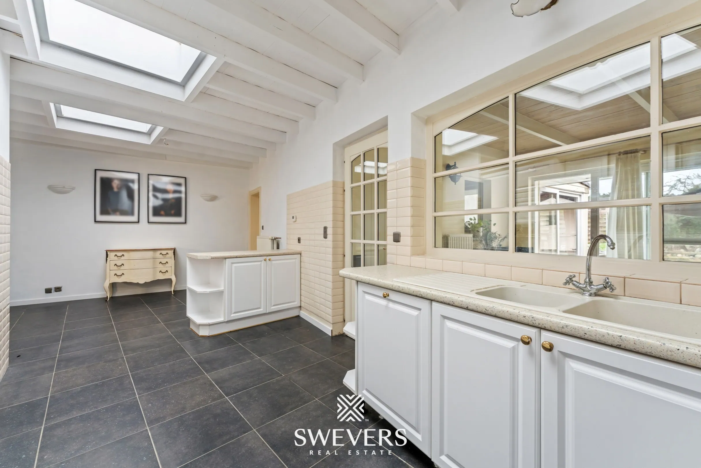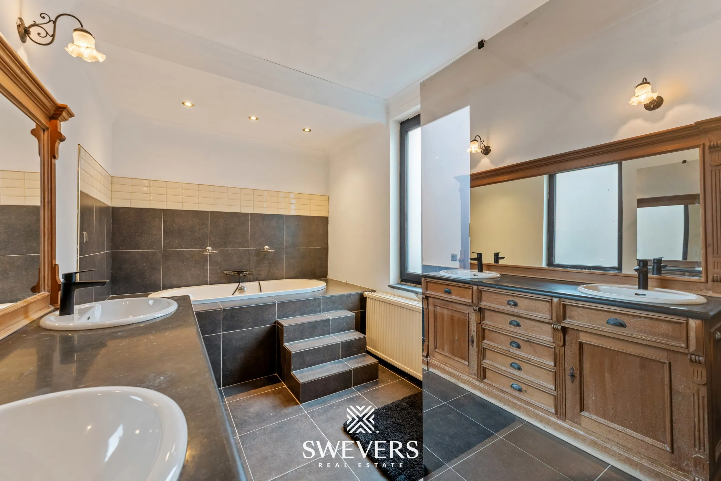 Op het gelijkvloers wordt de inkomhal centraal geplaatst, wat zorgt voor een efficiënte verbinding tussen de verschillende ruimtes. Aan de voorzijde bevindt zich een bureauruimte, ideaal als thuiskantoor of hobbykamer. De lichtrijke woonkamer en eetkamer vormen samen met de ruime keuken van 24 m² het hart van de woning. Vanuit de keuken is er toegang tot een tweede hal met aansluitend een praktische berging en de veranda. Verder zijn er twee aparte bergruimtes en een gastentoilet aanwezig. De inpandige garage van 17 m² is rechtstreeks toegankelijk vanuit de hal. Op het gelijkvloers zijn er ook maar liefst 2 badkamers aanwezig met ligbad, douche en dubbele lavabo.