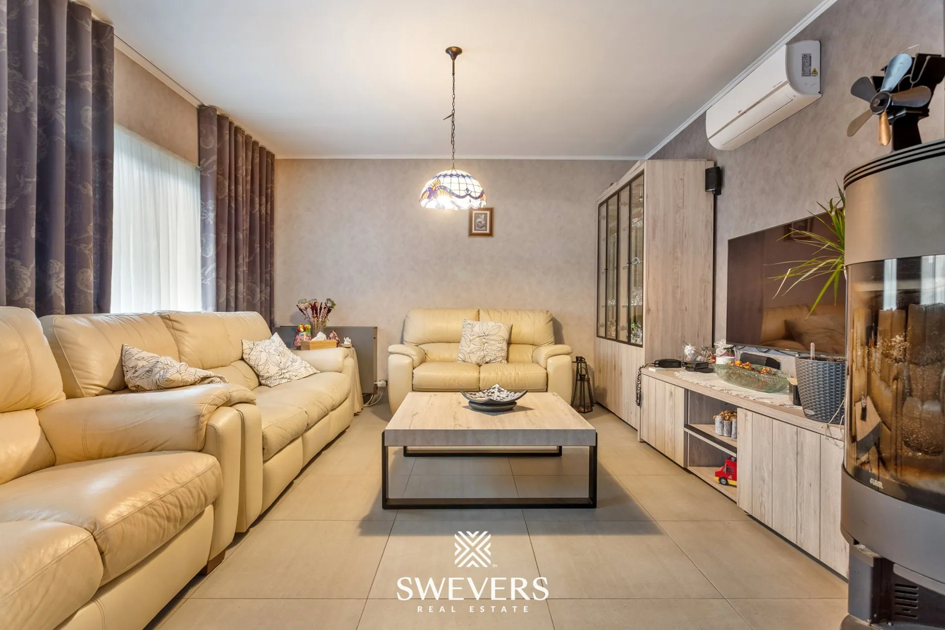 Bij het betreden van de woning komen we terecht in een centrale inkomhal met apart gastentoilet. Van hieruit is er toegang tot de riante leefruimte van bijna 37 m². Dankzij de grote raampartijen valt er overvloedig daglicht binnen, wat zorgt voor een warme en uitnodigende sfeer. De ruimte is praktisch ingedeeld met een zithoek aan de voorzijde en een eetplaats richting de keuken. De houtkachel voegt een gezellig accent toe tijdens koudere maanden, terwijl een airco zorgt voor de nodige verkoeling op warme dagen.