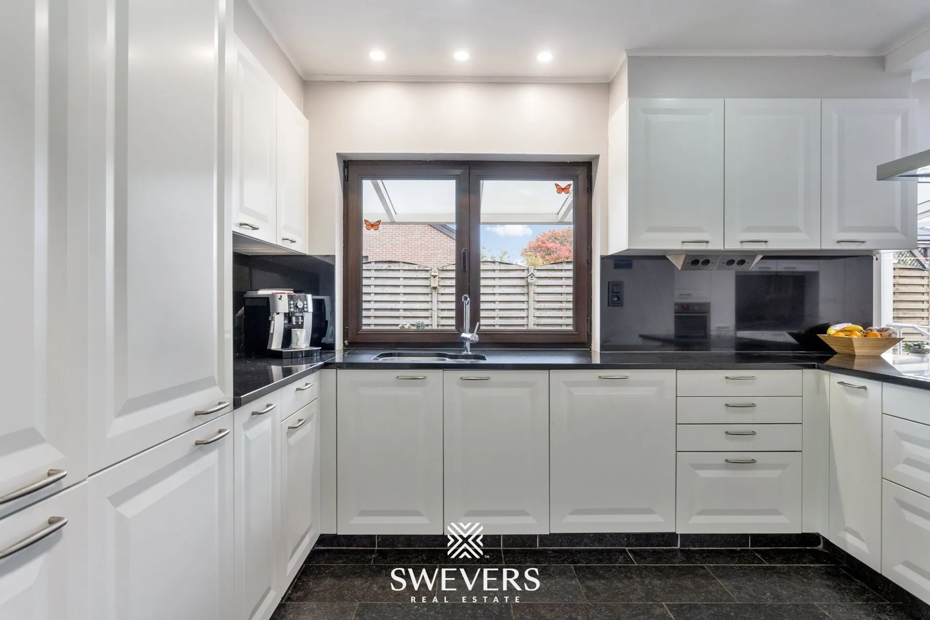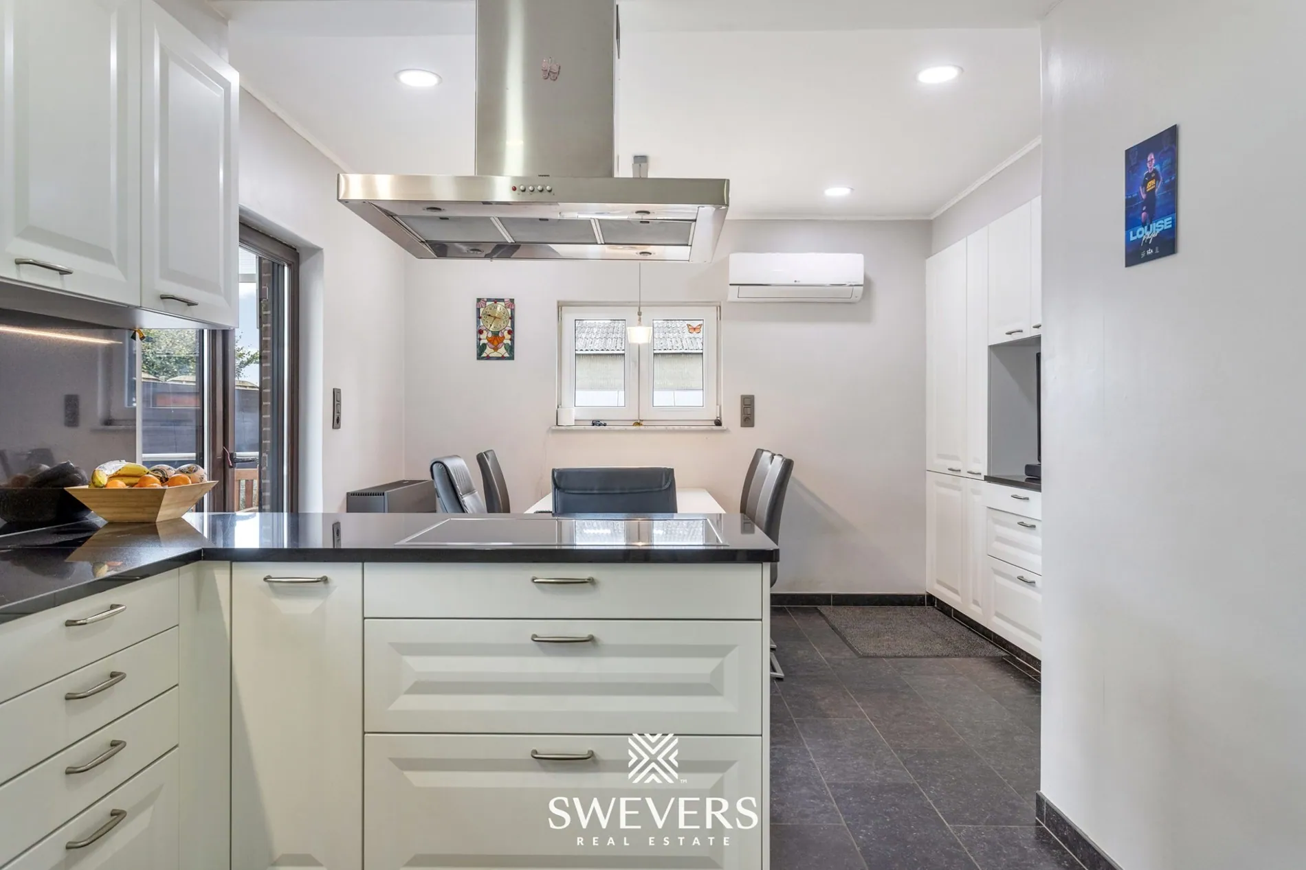 Aansluitend op de leefruimte vinden we de moderne leefkeuken van 23 m². Deze werd in 2015 volledig vernieuwd en uitgerust met kwalitatieve inbouwtoestellen en veel werk- en kastruimte. Dankzij de rechtstreekse toegang tot het terras is dit de perfecte plek voor wie graag kookt én geniet van het buitenleven. Verder bevinden zich op het gelijkvloers ook nog een slaapkamer van 17,4 m² en een recent vernieuwde badkamer. Die laatste is ingericht met een inloopdouche, lavabo en handige opbergkasten – allemaal strak afgewerkt in een tijdloos design.