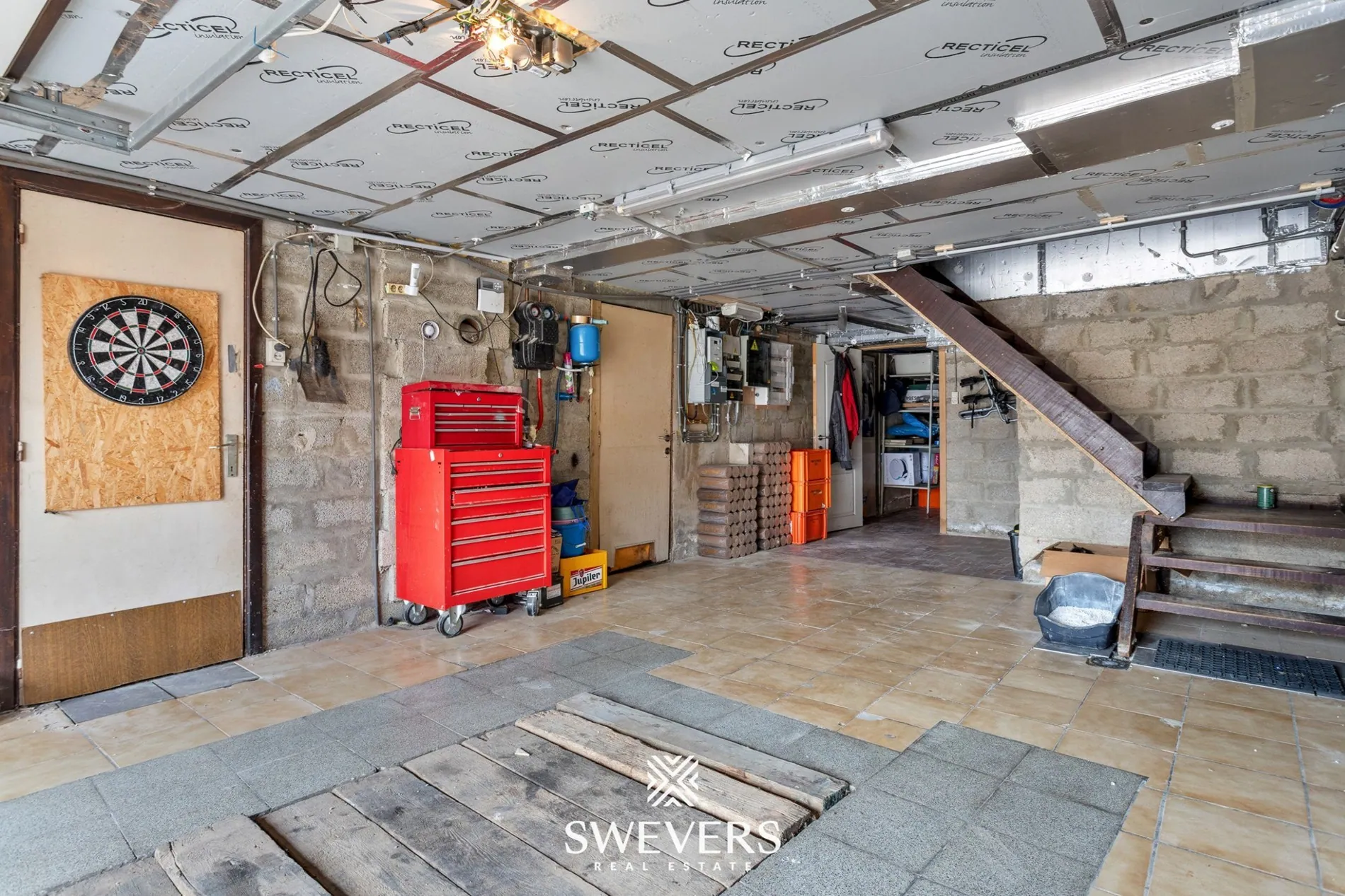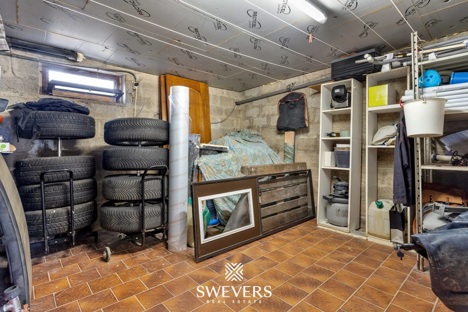 De woning is volledig onderkelderd, wat een enorme troef is op vlak van bergruimte en praktische invulling. De kelderverdieping biedt plaats aan een wasplaats, technische ruimte, extra opbergruimtes en een inpandige garage. De garage is bereikbaar via een inrit aan de voorzijde van de woning en biedt voldoende plaats voor een wagen én fietsen of tuinmateriaal.