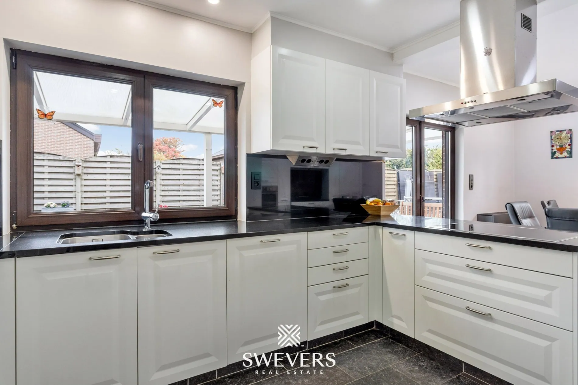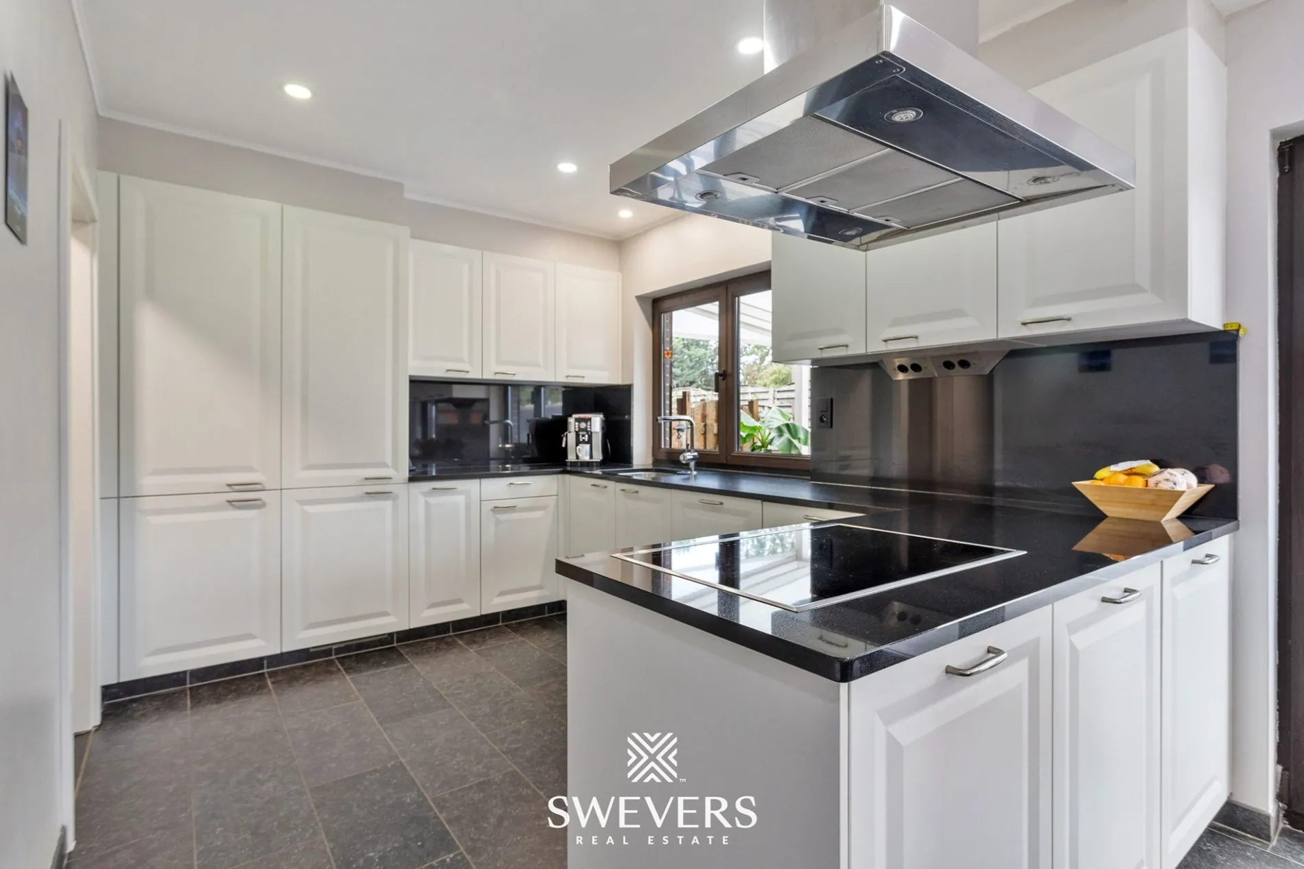 Aansluitend op de leefruimte vinden we de moderne leefkeuken van 23 m². Deze werd in 2015 volledig vernieuwd en uitgerust met kwalitatieve inbouwtoestellen en veel werk- en kastruimte. Dankzij de rechtstreekse toegang tot het terras is dit de perfecte plek voor wie graag kookt én geniet van het buitenleven. Verder bevinden zich op het gelijkvloers ook nog een slaapkamer van 17,4 m² en een recent vernieuwde badkamer. Die laatste is ingericht met een inloopdouche, lavabo en handige opbergkasten – allemaal strak afgewerkt in een tijdloos design.
