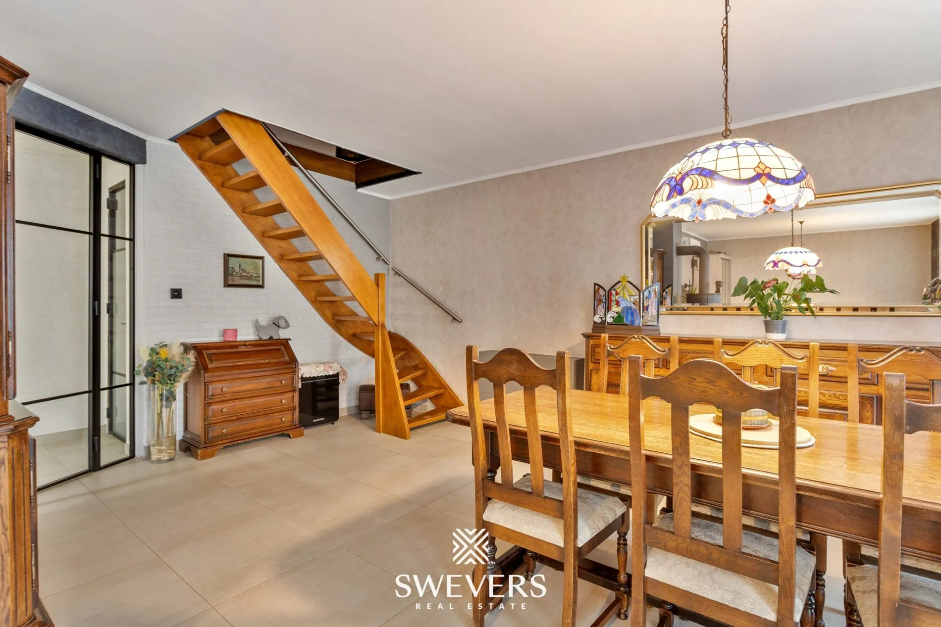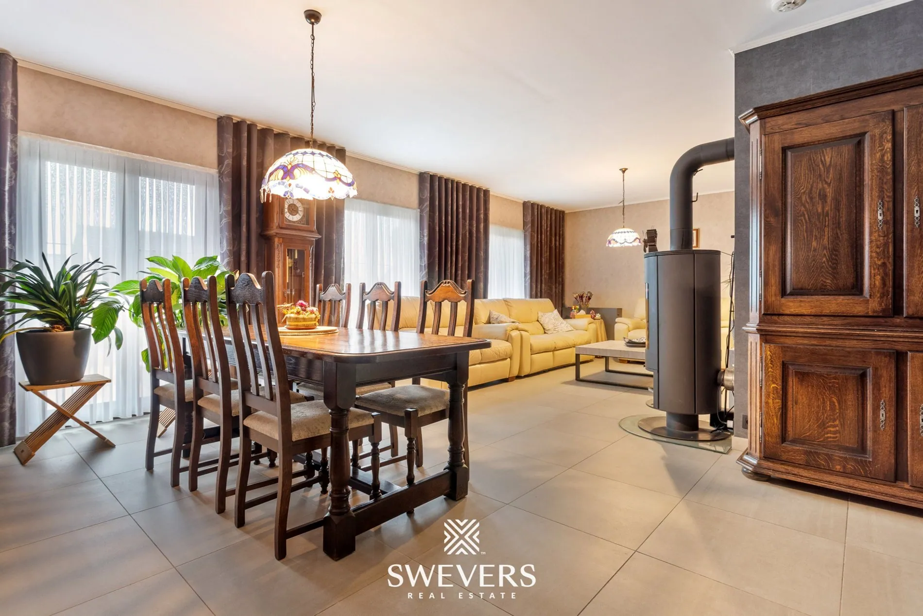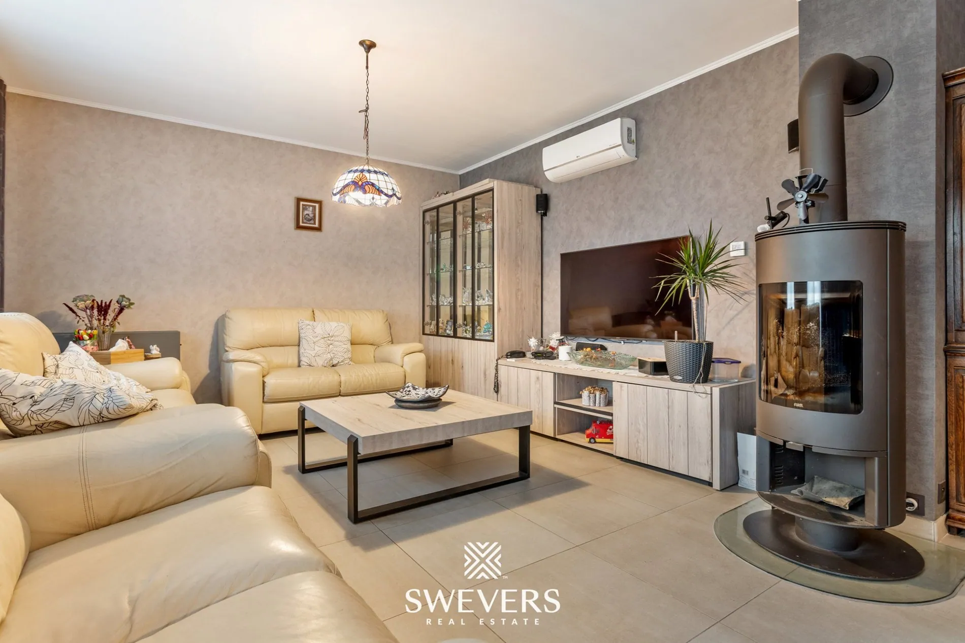 Bij het betreden van de woning komen we terecht in een centrale inkomhal met apart gastentoilet. Van hieruit is er toegang tot de riante leefruimte van bijna 37 m². Dankzij de grote raampartijen valt er overvloedig daglicht binnen, wat zorgt voor een warme en uitnodigende sfeer. De ruimte is praktisch ingedeeld met een zithoek aan de voorzijde en een eetplaats richting de keuken. De houtkachel voegt een gezellig accent toe tijdens koudere maanden, terwijl een airco zorgt voor de nodige verkoeling op warme dagen.