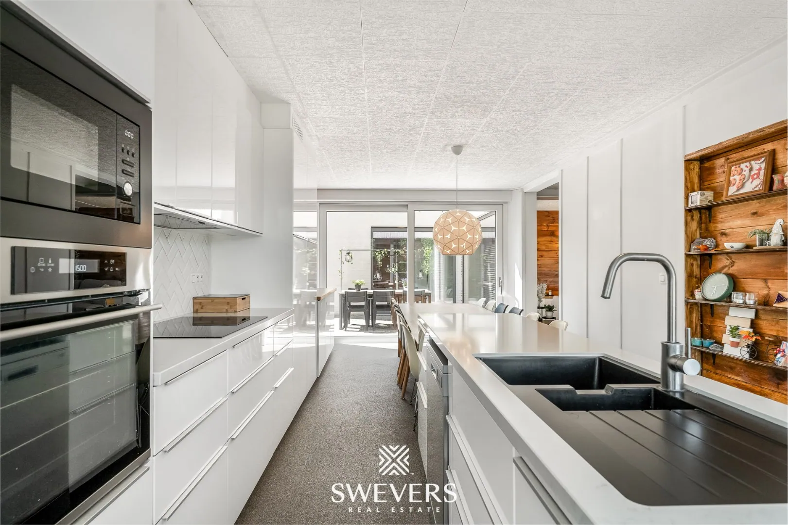 De gevel werd gekaleid en straalt in zijn witgrijze tinten een moderne elegantie uit. Binnen werden warme materialen gecombineerd met een tijdloos kleurenpalet, wat resulteert in een sfeervolle, hedendaagse woonstijl. De oriëntatie van het perceel naar het zuiden garandeert maximale lichtinval en zonovergoten buitenmomenten.