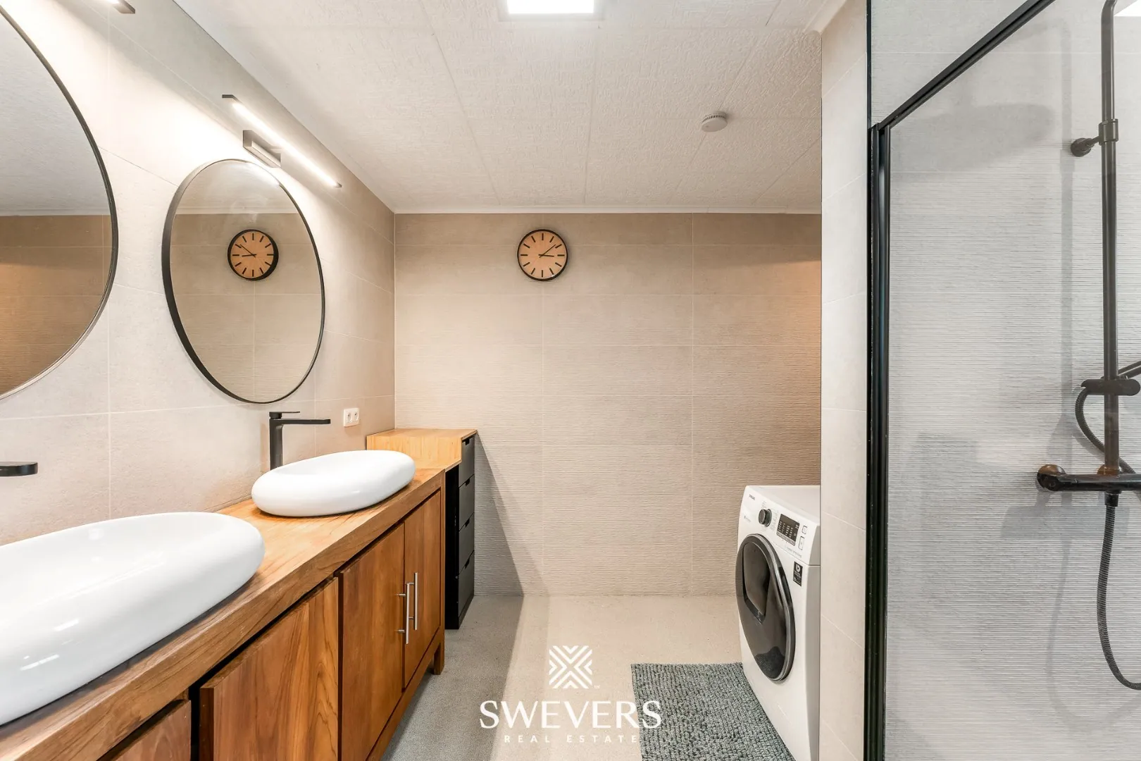 De woning telt in totaal vier volwaardige slaapkamers (15, 14,4, 12,3 en 12,2 m²) verdeeld over de eerste en tweede verdieping. Op de bovenste verdieping geniet de master bedroom bovendien van een riante inloopdressing van 12,2 m²—een droom voor elke garderobeliefhebber. Twee luxueuze badkamers van respectievelijk 16 en 14,32 m² bieden bad, inloopdouche, dubbele wastafels en wc's, met extra apart toilet voor gasten.