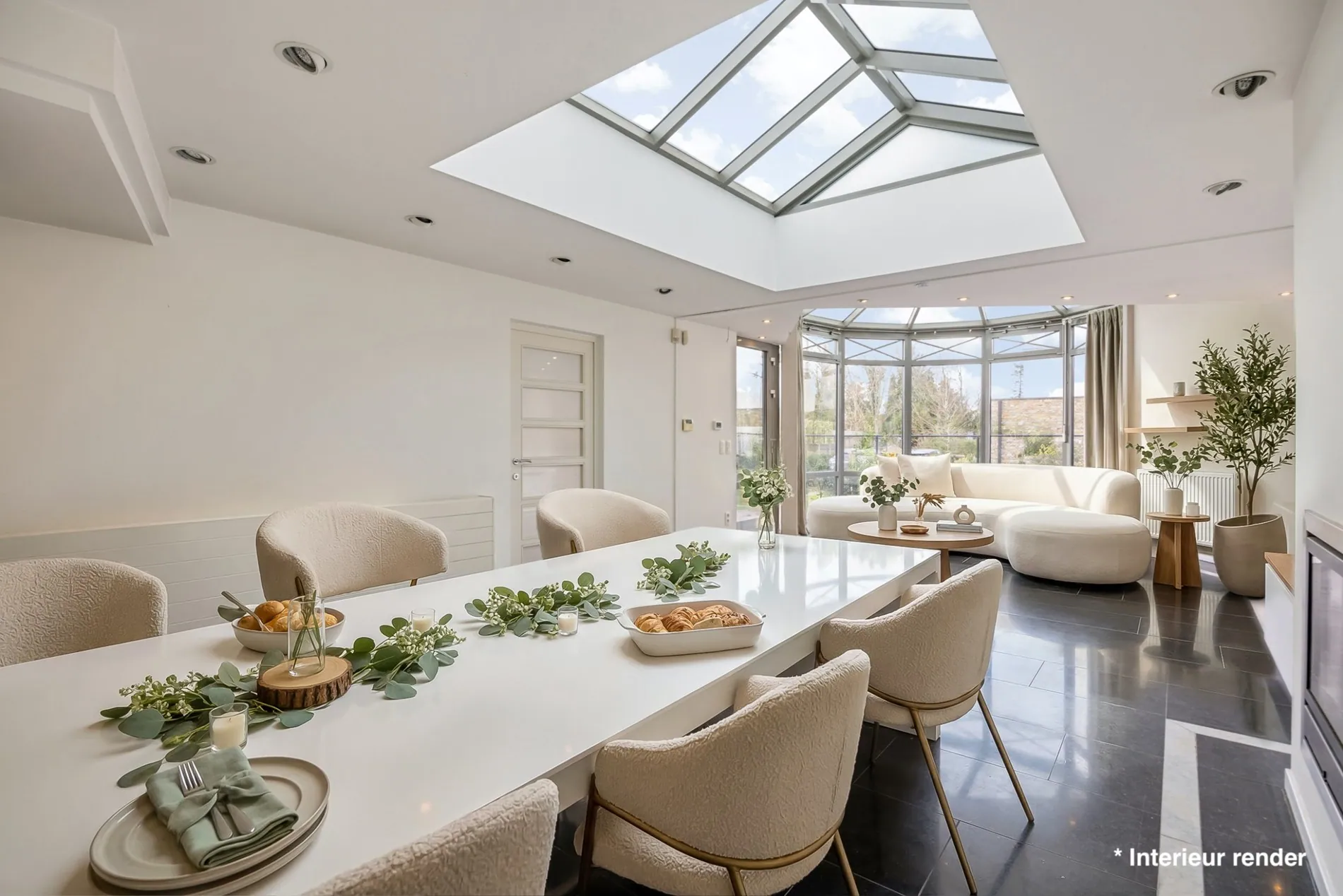 Op het gelijkvloers ontvouwt zich een ruime en functionele leefomgeving. Twee afzonderlijke woonkamers creëren verschillende zithoeken en bieden flexibiliteit in gebruik. Eén ruimte kan bijvoorbeeld ingericht worden als tv-hoek of bureauruimte. Een optionele schouw maakt het mogelijk om een haard te plaatsen. De eetkamer vormt het centrale punt tussen de leefruimtes en de keuken. De keuken heeft een oppervlakte van 8,7 m² en werd twee maanden geleden voorzien van nieuwe toestellen en een nieuw keukenblad. Aansluitend bevindt zich een praktische berging die extra opbergruimte biedt. De living zelf beschikt over een oppervlakte van 34,8 m² en is voorzien van airconditioning.